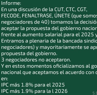 La decisión fue tomada en una reunión plenaria de la bancada sindical, donde 35 de los 40 negociadores respaldaron la propuesta gubernamental. Tres representantes se opusieron al acuerdo, mientras que los restantes no especificaron su postura. Tras la aprobación mayoritaria, los sindicatos procedieron a oficializar su aceptación al gobierno nacional.